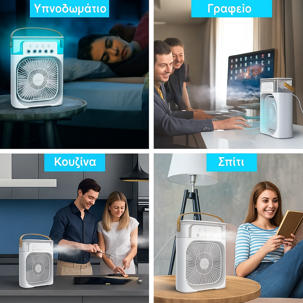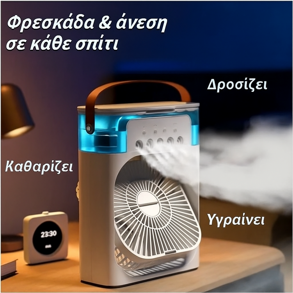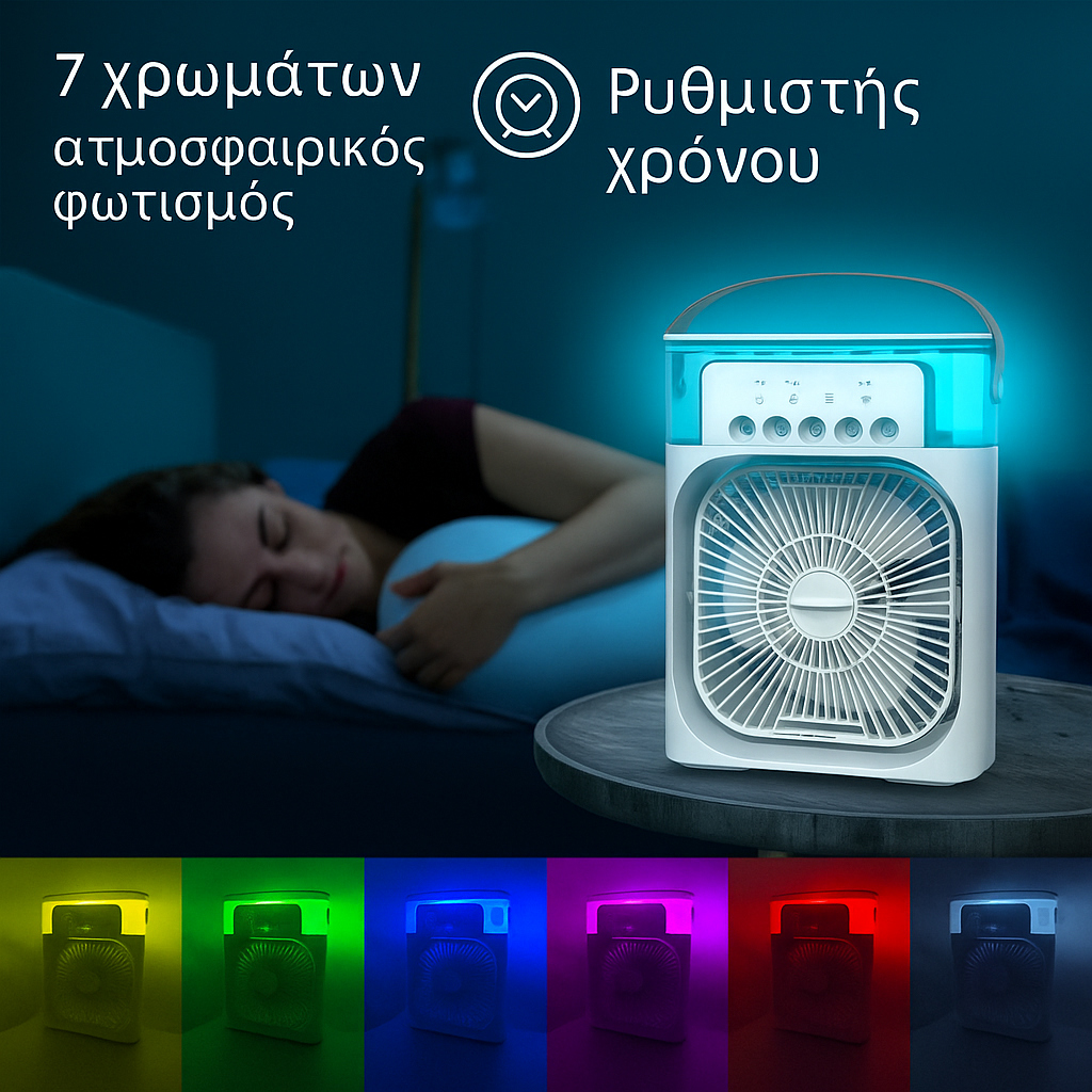 Το προσωπικό κλιματιστικό, που θα σας προσφέρει ψυχρό αέρα, χωρίς να αυξήσει τους λογαριασμούς ρεύματος. Έχει 3 λειτουργίες ταχύτητας, λειτουργία ύγρανσης. ψεκασμού νέφους, χρονοδιακόπτη για αυτόματη απενεργοποίηση και 7 διαφορετικους φωτισμούς για ευχάριστο κλιμά στο σκοτάδι